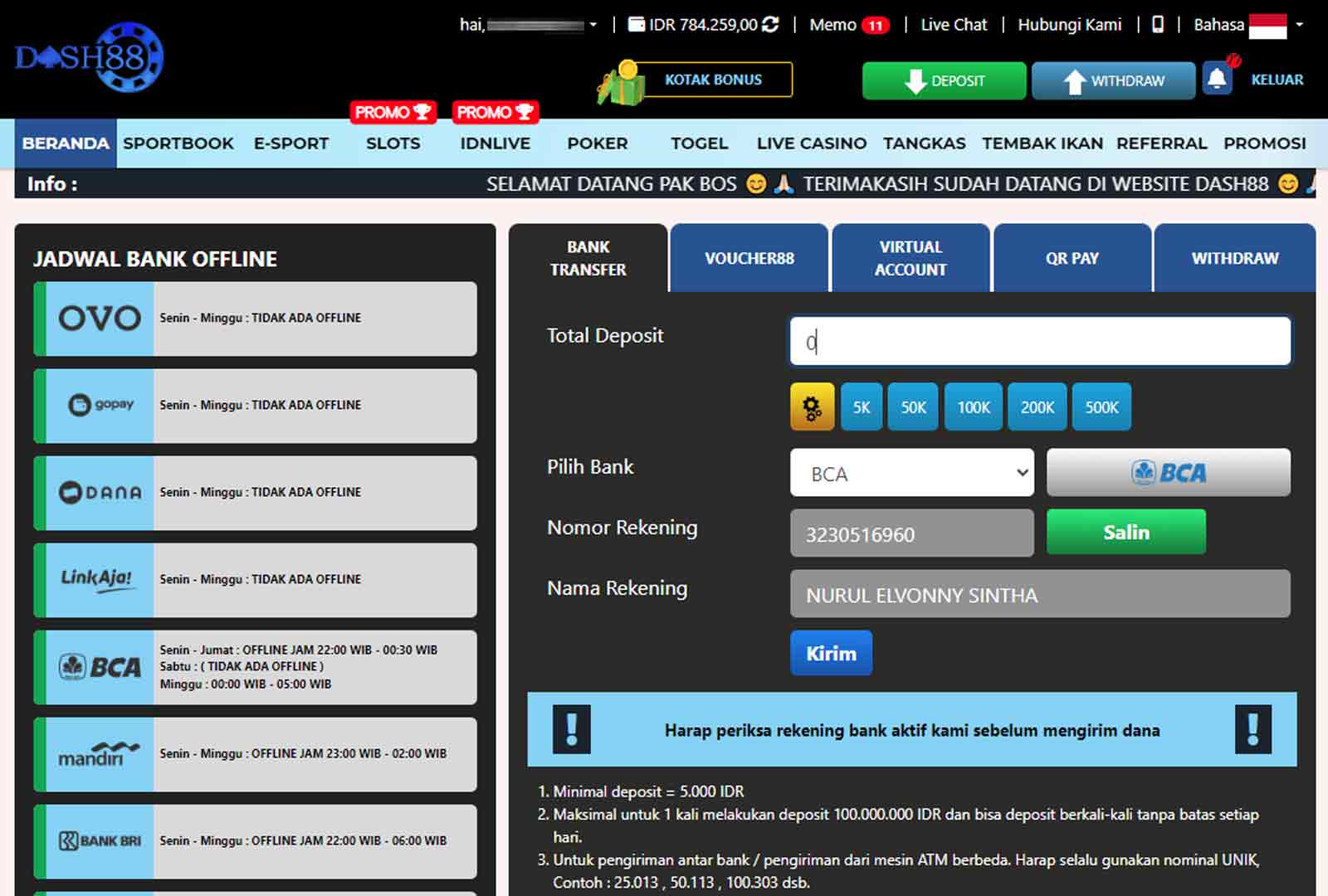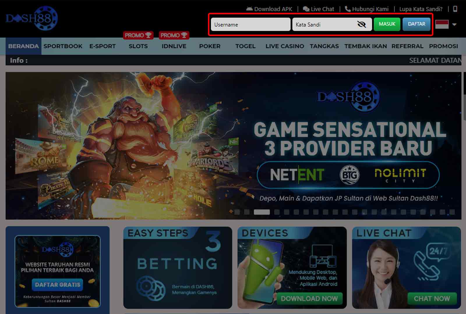 Untuk website DASH88 yang asli Anda diharuskan login dengan username dan password Anda yang benar dan telah terdaftar di DASH88.