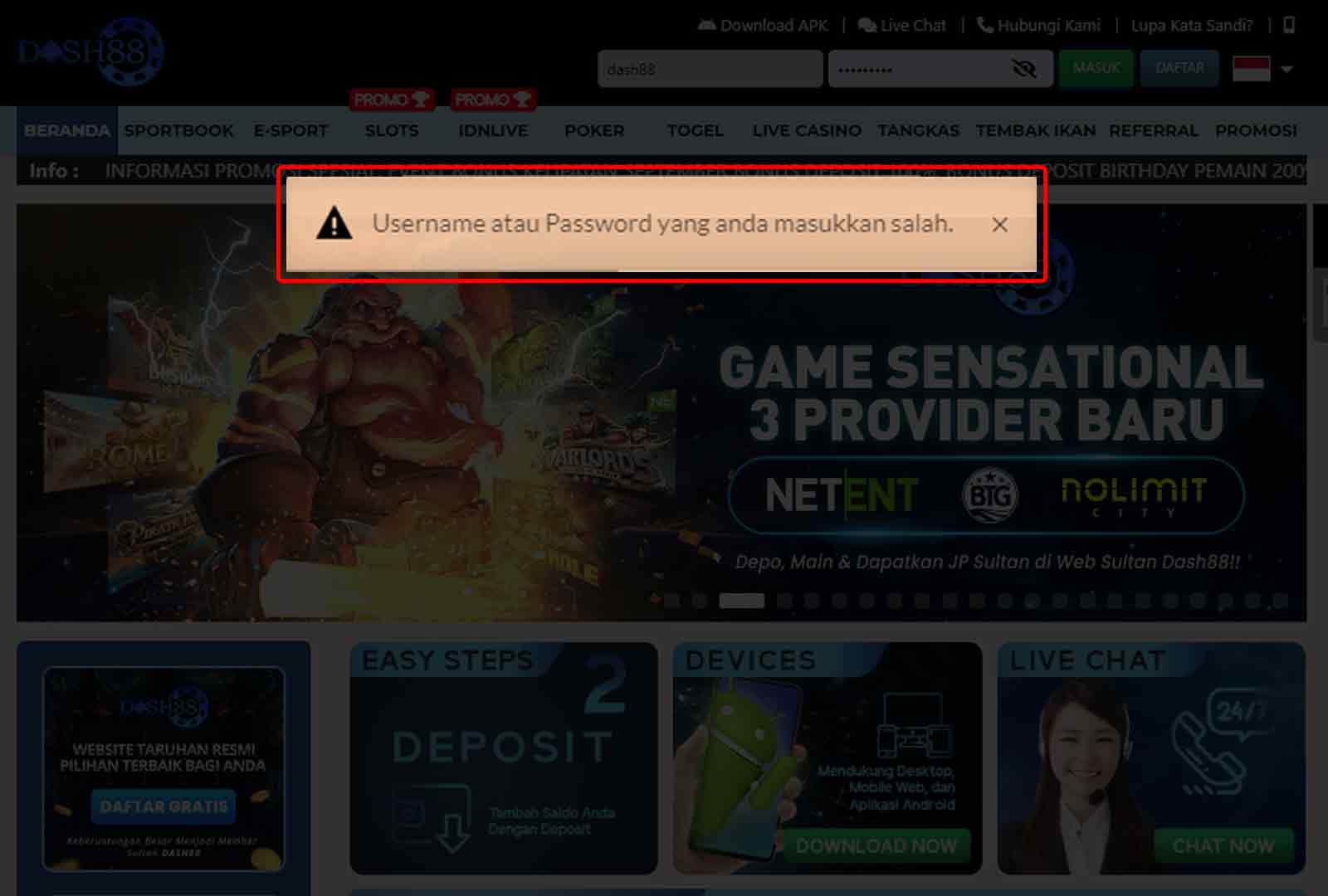 Jika Anda login menggunakan username dan password sembarang (belum terdaftar di akun DASH88) maka akan muncul pemberitahuan "Username atau Password yang Anda masukkan salah".